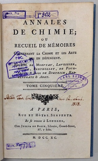 Annales de chimie; ou recueil de mémoires concernant la chimie et les arts qui en dépendent. Par MM. de Morveau, Lavoisier, Monge, Berthollet, de Fourcroy (et al.). Tome 5. Paris, Rue et Hotel Serpente, 1790. 2 Bl., 283 S. Mit 1 Kupfertafel. Moderner Pappband. Früher Band der wichtigen wissenschaftlichen Zeitschrift, die unter diesem Namen von 1789 bis 1815 erschien. Enthält einen Beitrag von Gaspard Monge "Sur la cause des principaux phénomènes de la météorologie" (Poggendorff II, 186), zwei Beiträge von de Fourcroy, darunter sein "Mémoire sur les différens états du cimetière des Innocens en 1786 et 1787" in dem er die Entdeckung des Leichenfetts "als ein Gemenge von Seifen und Basen" (Darmstaedter 245) beschreibt. Ferner mit einer Analyse der Tamarinde des bedeutenden Chemikers Louis Nicolas Vauquelin (Ferchl 553), den "Observations sur le platine" von Antoine Laurent Lavoisier u.a. - Leicht gebräunt, Vortitel u. Titel mit Besitzvermerk u. mehrfach gestempelt.