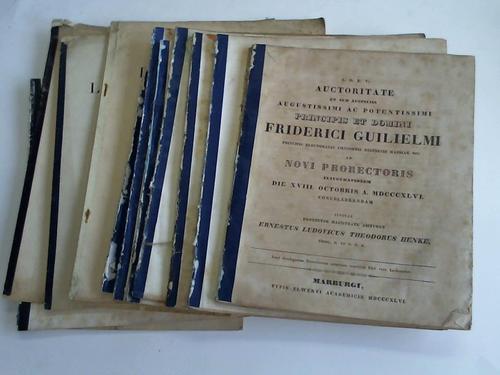 12 Philogische Abhandlungen Marburg, Bayrhofferi, 1831. 1885. Zusammen ca. 500 Seiten, broschiert, Quart (Teils fleckig/ einige Randläsuren)---- Enthalten: Quaestiones duas ad Aristophanis Aves spectantes praemisit von Julius Cesar / Quaestionis de Pindaricorum carminum chronolohia supplementum alterum von Leopoldi Schmidtii / Insunt observationes ad vitam sancti Galli speetantes von Fridericus Guilielmus Rettberg / Quaestiones sterometricae, potissimun ad therorema Euleri de numeris planorum superficialium, canthorum et acuminum in polyedris spectantes von Ioann. Friederic. Christian. Hessel / Insunt latinae Vet. Test. Versionis antehieronymianae fragmenta e cod. Fuldensi eruta atque adnotationibus criticis instructa, quibus accedit tabula lithographica von Ernestus Ranke / Inest disputationis de miraculorum Jesu Christi natura et necessitate particula I. von Julius Mueller / Ad illustrandam dogmatis de coena sacra historiam codicum Syriacorum specimina e Museo Britannica exhibentur von Franciscus ed. Christ. Dietrich / inest ineditorum historiam ecclesiasticam et jus canonicum illustrantium par von Aemilius Ludovicus Richter / Inest Augusti friderici Christiani Vilmar, Theologiae P. P. O. von Fridericus Ludovicus Stegmann / Inest theologorum Saxonicorum consensus repetitas fidei vere Lutheranae von Ernestus Ludovicus Theodorus Henke / Inest dissertatio de nexu, quem primi fidei christianae in Germania nunlii cum sede Romana habuerant von Fridericus Guilielmus Rettberg / Inest de epistola ad herbraeos commentatio historica von Henricus Guilielmus Josias Thiersch. Text Latein -.