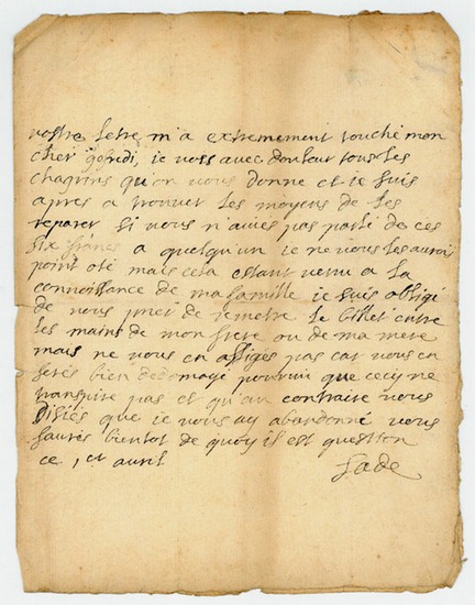 Autograph letter signed. N. p., 1 April [before 1800]. 1 p. with address and fragments of a broken red wax seal on verso. To Gaspard-Francois-Xavier Gaufridi (Gaufridy, 1757-99), his father's longtime legal advisor, describing a complicated legal and financial incident involving six francs, the knowledge of de Sade's family, and a reimbursement, and mentioning his brother Louis-Marie: "Votre lettre m'a extrêmement touché mon cher Gofredi, je vois avec douleur tous les chagrins qu'ont vous donné et je suis prêt à trouver les moyens de les réparer. Si vous n'aviez pas parlé de ses six francs à quelqu'un, je ne vous les aurai point ôté. Mais célà étant venue à la connaissance de ma famille je suis obligé de vous prier de remettre le billet entre les mains de mon frère ou de ma mere. Mais ne vous en affligez pas, car vous en ferez serez bien dedamager parvenu que ceci ne transpire pas et qu'au contraire vous disiez que je vous ai abandonné. Vous saurez bientôt de quoi il est question. Sade" (punctuation added). - Old folds, toning, corners folded.