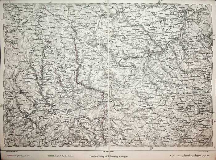 SIMMERN (=BLATT Nr.: 179; G. D. Reymann's topographische Special-Karte von Central-Europa = G. D. Reymann's topographische Special-Karte von Deutschland, Schweiz, Ostfrankreich, Belgien, Niederlande, u. Polen Masstab 1:200000) Glogau, Verlag Carl Flemming, ca. 1860. Landkarte, Stahlstichkarte mit Grenzkolorit, Format: ca. 26 x35,5 cm, in 2 Segmenten auf Leinen gezogen; gez. v. Fils. Gest. v. Carl J?ttnig, Zustand: gut +. G. D. Reymann's topographische Special-Karte von Central-Europa = G. D. Reymann's topographische Special-Karte von Deutschland, Schweiz, Ostfrankreich, Belgien, Niederlande, u. Polen Masstab Ma?stab Massstab 1:200000, Spezialkarte, Spezial-Karte, Special-Karte, Specialkarte, 1:200 000, 1:200 000, Stahlstich, Landkarte, Begr?ndet von Daniel Gottlob REYMANN (1759-1837 ) weitergef?hrt von Karl Wilhelm von OESFELD(1781-1843) sp?ter von Friedrich HANDTKE (1815-1879).