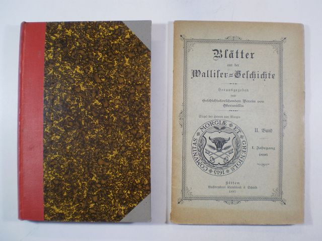 Konvolut: Blätter aus der Walliser Geschichte / Blätter aus der Walliser-Geschichte Sitten / Brig, C. Gessler / Kleindienst & Schmid / Peter Pfefferle / Tscherrig & Tröndle, 1890-1917. Halbleinen; fester, privater (um 1900) Einband, marmoriertes Überzugspapier, roter Rücken (1. Jahrgang 1890) / broschiert (alle anderen) / 5 in 1 Buch und 15 Broschuren Bände / Anz. Seiten: 302, 467, 468, 472, XIII / 14 x 21 cm / Zustand: gut, leichte Gebrauchsspuren; Papier gebräunt, Broschuren geringfügig randlädiert, teils unaufgeschnitten, 1 Einband fleckig. Das Konvolut beinhaltet folgende Einzelbände: 1. Band (3 Jahrgänge in 1 Band, 1890-1892); 2. Band (6 Jahrgänge im 5 Broschuren, 1896-1901); 3. Band (5 Jahrgänge in 5 Broschuren, 1902-1906); 4. Band (II., III. , IV und V. Jahrgang in 3 Broschuren; der erste Jahrgang fehlt); 5. Band (1. Jahrgang 1914 sowie III und IV: Jahrgang 1916/17 in 2 Broschuren, der 2. Jahrgang fehlt).