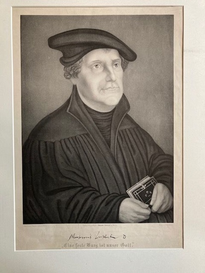 Martin Luther. Eine feste Burg ist unser Gott. (Faksimilierter Schriftzug). Porträt nach rechts schauend. (Nach dem Porträt von Lucas Cranach). Berlin, Verlag Werner Grosse, ca 1880. 41,5 x 37,5 cm auf 65,2 x 46 cm 1 Blatt. Original Lithographie. Unter Passepartout. Die Versandkosten für Kunstwerke und mehrbändige Werke können von den Standard-Versandkosten abweichen. Etwas angestaubt, leichte Schabspuren, sonst gut erhalten. Sehr seltene großformatige Lithographie von Martin Luther, nicht im Katalog von Albrecht Geck. "Luther im Visier der Bilder". Münster, LIT Verlag, 2018. enthalten.