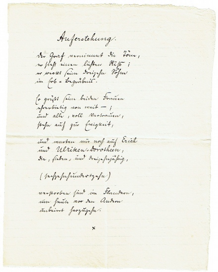 Eigenhändiges Gedicht. o. O. u. J. 4to. 1 p. Liniertes Bütten. ?Auferstehung. | Der Graf vernimmt die Töne | er sieht einen lichten Riss; | er weckt seine dreizehn Söhne | im Erb-Begräbnis. | Er grüßt seine beiden Frauen | ehrerbietig von weit -; | und alle, voll Vertrauen, | sehn auf zur Ewigkeit, | und warten nur auf Erich | und Ulriken=Dorotheen, | die, sieben=und dreizehnjährig, | (sechzehnhundertzehn} | verstorben sind im Flandern, | um heute vor den Andern | unbeirrt herzugehn.? - Geschrieben 1906 in Paris. Aus den 1907 erschienenen ?Neuen Gedichten?.