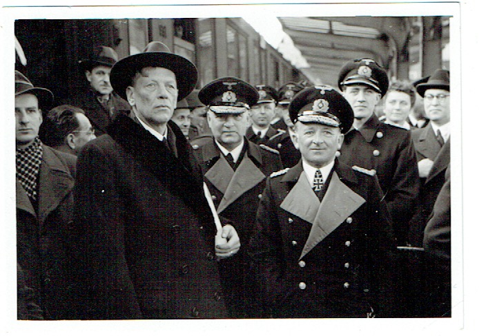 Original-Photographie ohne Unterschrift. ohne Ort, 30. III. 1944. 84 : 61 mm. Gruppenfotografie, die Knappertsbusch zusammen in Begleitung von Admiral zur See Schrader am Bahnhof zeigt.