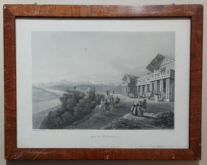 Vue de l'Ütliberg (Üetliberg). Gravé par Hürlimann. Aquatinta. Schafhouse, publ. par L. Bleuler, (um 1840). Bildgrösse: 20,5x30 cm. Gerahmt (32x40,8 cm). Das Gast- und Kurhaus im Schweizer Holzstil auf dem Üetliberg-Gipfel wurde 1839-1840 vom Architekten Johann Jakob Breitinger erbaut. - (Kleine Stockflecken im Rand, wenige im Bild. Kleiner Wasserfleck in der unteren linken Ecke. Rahmen mit Kratzspuren.