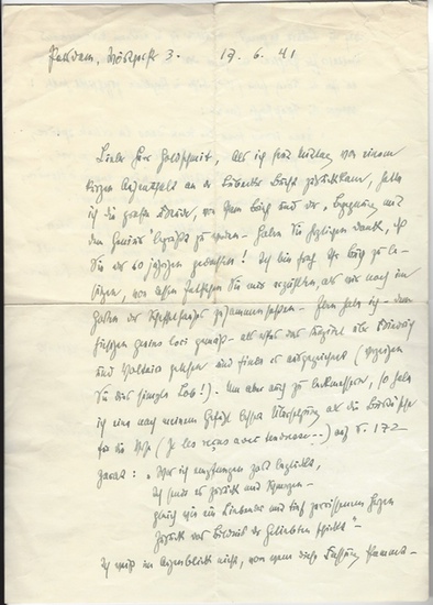 Eigenh. Brief mit U. (?A. Griesebach?). Potsdam, 17. Juni 1941. 1? SS. Gr.-4to. An den Publizisten Rudolf Goldschmit-Jentner (1890?1964) mit Dank für die Zusendung von dessen im Jahr zuvor erschienenem Buch ?Die Begegnung mit dem Genius? und einer kleinen Anmerkung zu einer zitierten Übersetzung im Kapitel ?Friedrich und Voltaire: ?[...] Um aber auch zu beckmessern, so habe ich eine nach meinem Gefühl bessere Übersetzung [...] für die Verse (Je les recus avec tendresse ...) auf S. 172 parat [...]?. ? August Grisebach ?gehörte nicht zu jenen ?Altmeistern der Kunstgeschichte?, welche ihr Fach so nachhaltig geprägt haben, dass sie selbst zum Forschungsgegenstand aufrückten. Seine Bedeutung hatte er als Lehrer und Vermittler [...] [Er] gehört neben Kurt Gerstenberg zu den Begründern der systematischen deutschen Kunstgeographie. Sein Forschungsgebiet wurde im Zweiten Weltkrieg entweder zerstört oder rückte als dessen Folge aus dem geographischen Blickwinkel: Die alte deutsche Stadt, das deutsche Rathaus, die Städte Danzig und Breslau, die Kunstlandschaft Schlesiens, die Kunst Karl Friedrich Schinkels? (Wikipedia, Abfrage v. 11. XII. 2009). ? Etwas knittrig.