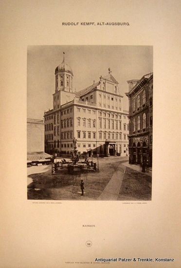 Alt Augsburg Eine Sammlung architectonischer und kunstgewerblicher Motive. Text von A. Buff. Berlin, Kanter u. Mohr, 1898. Fol. (Rückenhöhe 49 cm). Titel, 100 Lichtdruck-Tafeln (Format ca. 32 : 48 cm) mit 183 Abbildungen nach Fotografien von Hugo Köhle (121) u.a. und 22 S., 1 Bl. Begleittext. Lose in Orig.-Leinenmappe; die Schließbänder fehlen. Schöne Mappe, der "für lange Zeit umfangreichsten, als hochwertiger Druck erschienenen Augsburger Fotodokumentation" (Häußler, Fotografie in Augsburg 1839 bis 1900, S. 200). Der sonst nicht weiter als Fotograf nachweisbare Hugo Köhle wirkte als Zeichenlehrer an der städt. Baugewerkeschule, deren Direktor Herausgeber Rudolf Kempf war.